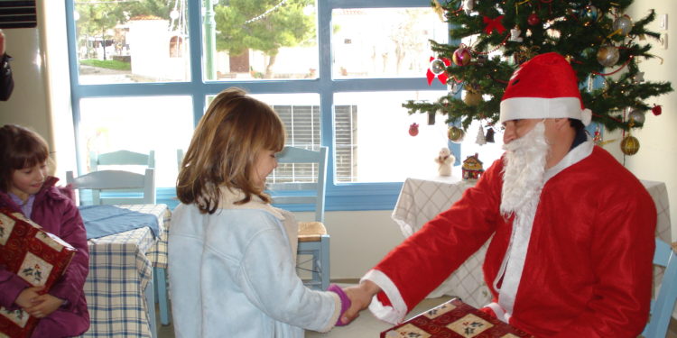 Η αντιπροσωπεία με Άγιο Βασίλη και δώρα έφτασε με Super Puma και τους υποδέχθηκαν οι κάτοικοι και τα λιγοστά παιδιά του νησιού.