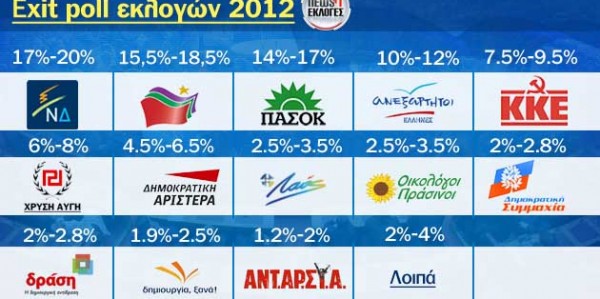 Βάσει των πρώτων προγνωστικών (…) τα κόμματα της λιτότητας, η συντηρητική ΝΔ και το σοσιαλιστικό ΠΑΣΟΚ τιμωρήθηκαν βαριά. Μπορεί η ΝΔ να είναι πιθανότατα η πρώτη δύναμη στο νέο κοινοβούλιο, ωστόσο στη δεύτερη θέση ακολουθεί το ακροαριστερό ΣΥΡΙΖΑ το οποίο θέλει να επαναδιαπραγματευτεί όλες τις συμφωνίες της Ελλάδας με τους πιστωτές της. (…)