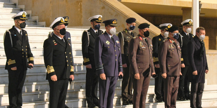 Την Παρασκευή 31 Δεκεμβρίου 2021 και στον προαύλιο χώρο του Στρατοπέδου «ΠΑΠΑΓΟΥ» ο Α/ΓΕΕΘΑ Στρατηγός Κωνσταντίνος Φλώρος συνοδευόμενος από τον Αρχηγό ΓΕΑ Αντιπτέραρχο (Ι) Γεώργιο Μπλιούμη, τον Αρχηγό ΓΕΣ Αντιστράτηγο Χαράλαμπο Λαλούση και τον Αρχηγό ΓΕΝ Αντιναύαρχο Στυλιανό Πετράκη ΠΝ άκουσε τα Κάλαντα της Πρωτοχρονιάς από την Μικτή Χορωδία των Ενόπλων Δυνάμεων. Παρέστη επίσης ο Διευθυντής του Γραφείου του Υπουργού Εθνικής Άμυνας κ. Νικόλαου Παναγιωτόπουλου κ. Αθανάσιος Βάλαρης.