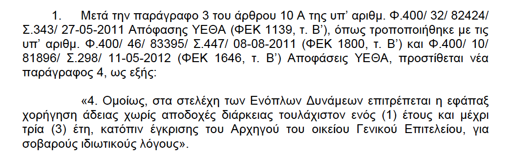 Δημοσιεύτηκε η απόφαση της ΑΝΥΕΘΑ Φώφης Γεννηματά με την οποία οι στρατιωτικοί μπορούν να λαμβάνουν “από ένα έως και τρία έτη άδεια άνευ αποδοχών θα μπορούν να παίρνουν οι στρατιωτικοί για «σοβαρούς ιδιωτικούς λόγους».