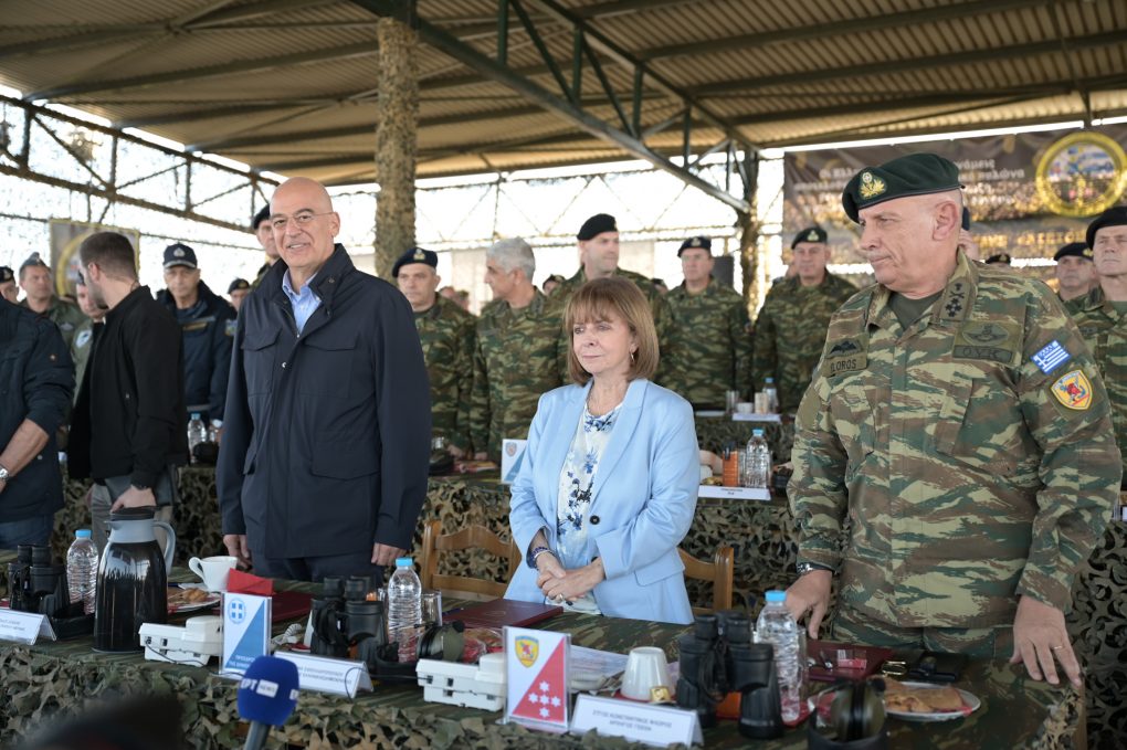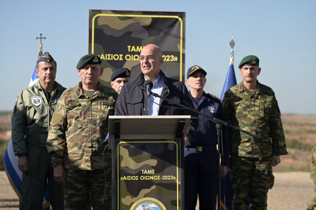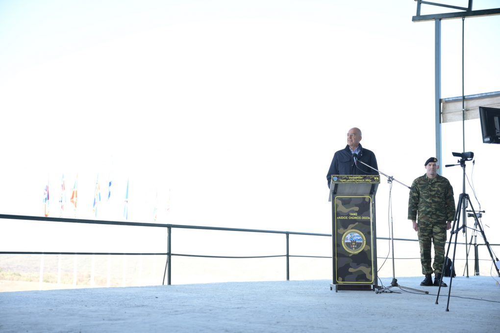 Ο Υπουργός Εθνικής Άμυνας, Νίκος Δένδιας, παρακολούθησε σήμερα, 7 Νοεμβρίου 2023, την τελική φάση της Τακτικής Άσκησης Μετά Στρατευμάτων «ΑΙΣΙΟΣ ΟΙΩΝΟΣ – 23» στο Πεδίο Βολής – Ασκήσεων «Ψηλός Στάλος» του Έβρου, παρουσία της Α.Ε. της Προέδρου της Ελληνικής Δημοκρατίας κ. Κατερίνας Σακελλαροπούλου.