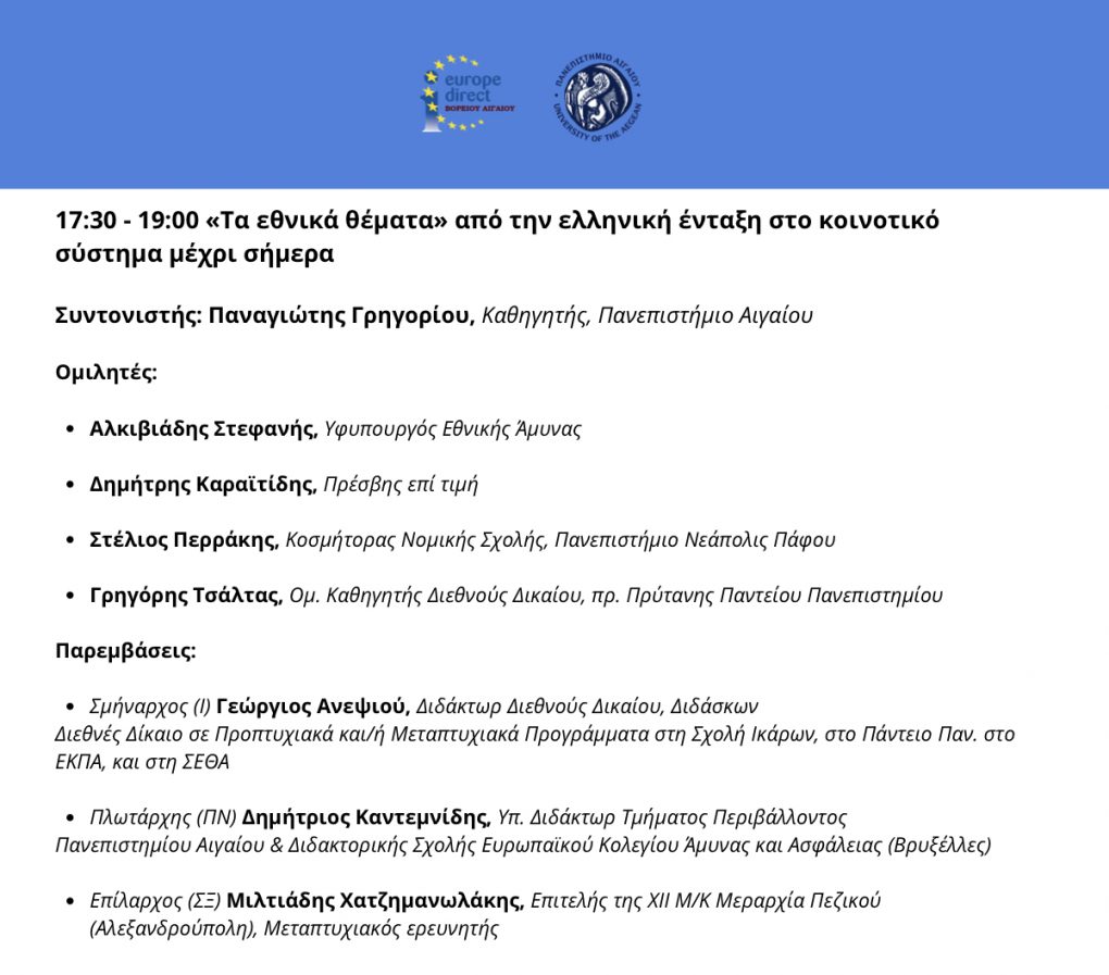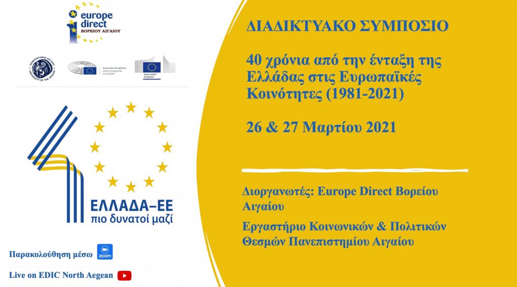 Η εισήγησή του έγινε σε συνεδρία του διήμερου διαδικτυακού Συμποσίου ενόψει των 40 χρόνων από την ένταξη της Ελλάδας στις Ευρωπαϊκές Κοινότητες (1981 – 2021) που διοργανώθηκε από το Europe Direct Βορείου Αιγαίου σε συνεργασία με το Εργαστήριο Κοινωνικών και Πολιτικών Θεσμών του Τμήματος Κοινωνιολογίας του Πανεπιστημίου Αιγαίου.