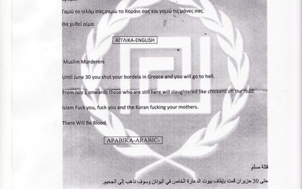 «Μουσουλμάνοι Δολοφόνοι, Μέχρι 30 Ιουνίου θα έχετε κλείσει τα μπουρδέλα σας στην Ελλάδα και θα έχετε πάει στο διάλο. Από την 1η Ιουλίου και μετά όσοι είστε ακόμη εδώ θα σας σφάζουμε σαν τα κοτόπουλα στο δρόμο. Γ@@@ το Ισλάμ σας, γ@@@ το Κοράνι σας και γ@@@ τις μάνες σας. Θα χυθεί αίμα». Το κείμενο μεταφράζεται στα αγγλικά και τα αραβικά.