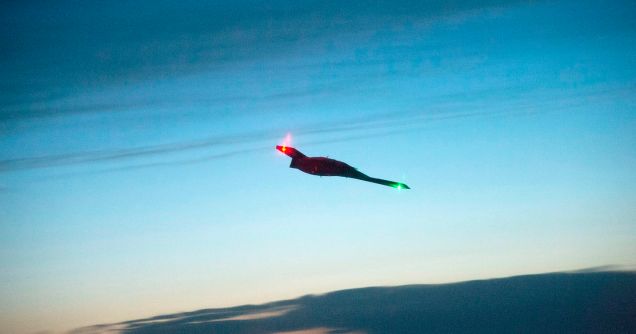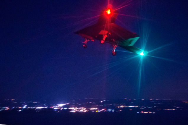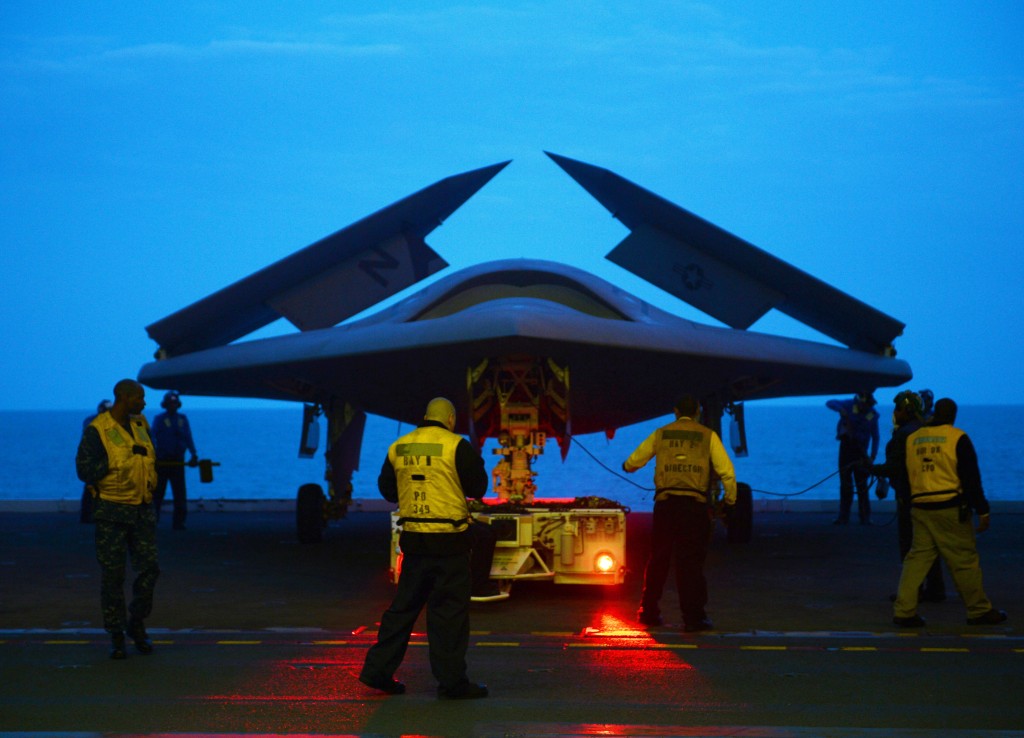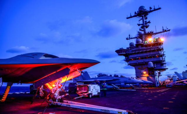Το X-47B σε νυχτερινές δοκιμές στο πεδίο της Air Systems Command, στο Πέτεκσεντ Ρίβερ, του Μέριλαντ, Απρίλιος 2014.