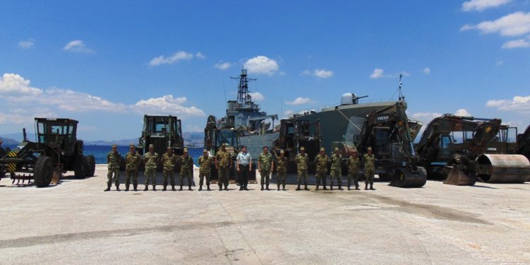 Kλιμάκιο εργασίας του 747 Ειδικού Τάγματος Μηχανικού (ΕΤΜΧ) το οποίο περιλαμβάνει 11 Μηχανήματα και 8 Οχήματα – Ειδικά Οχήματα ΜΧ, μεταφέρθηκε με αρματαγωγό του Πολεμικού Ναυτικού στην Ικαρία.