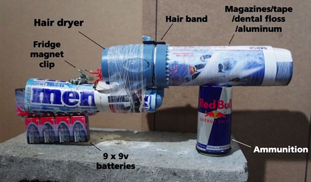 Ο Evan Booth από τη Βόρεια Καρολίνα «κατασκεύασε» ενα όπλο χρησιμοποιώντας ενα σεσουάρ μαλλιών, ενα αντρικό αποσμητικό, ενα κουτάκι Red Bull, ενα λαστΙχάκι, ενα προφυλακτικό, περιοδικά, μπαταρίες λιθιου και ένα μαγνήτη!
