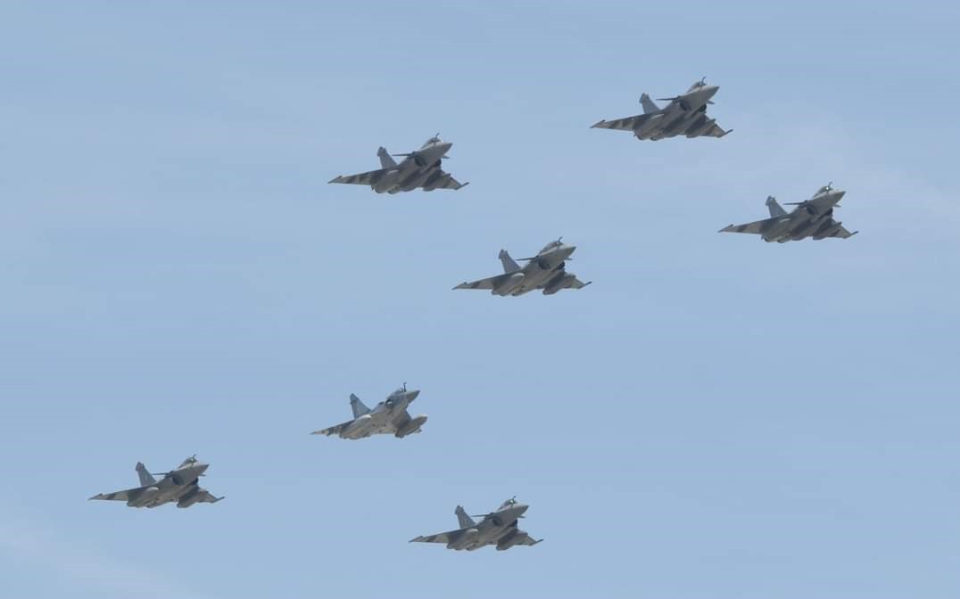 Τα δύο ελληνικά Rafale πέταξαν σε σχηματισμό μαζί με άλλα πέντε μαχητικά αεροσκάφη τρίτων χωρών, για να τιμήσουν την Εθνική Επέτειο της συμμάχου Γαλλίας.