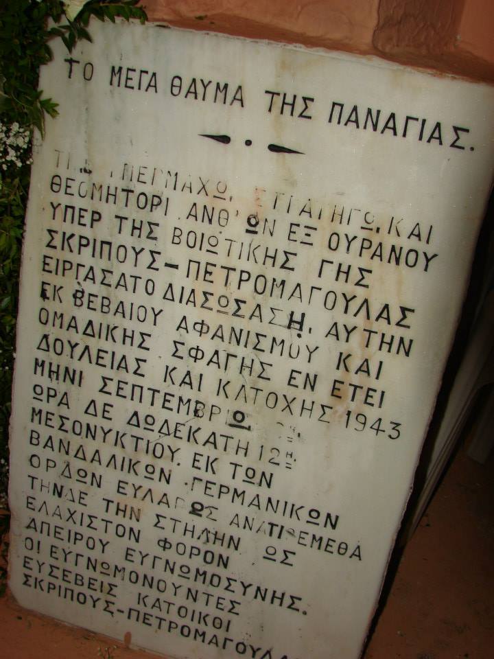 Εδώ, τα τανκς των Γερμανών καθηλώθηκαν το 1943 κινούμενα κατά των Ορχομένιων. Στο εκκλησάκι υπάρχει μια επιγραφή (φωτογραφία) με τιτλο »ΤΟ ΜΕΓΑ ΘΑΥΜΑ ΤΗΣ ΠΑΝΑΓΙΑΣ»