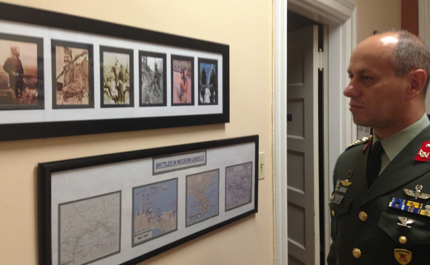 Μπαίνοντας στα γραφεία των Ακολούθων Άμυνας της ελληνικής πρεσβείας στην Ουάσινγκτον, νομίζεις ότι βρίσκεσαι σ΄ ένα σύγχρονο μουσείο στρατιωτικής ιστορίας. Ο Ακόλουθος Άμυνας καταδρομέας Ευάγγελος Παπαδόπουλος, μαζί με τους συναδέλφους του από την Αεροπορία και το Ναυτικό έχουν μετατρέψει το χώρο εργασίας τους σ΄ ένα μουσείο, που περιλαμβάνει φωτογραφίες από όλες τις πολεμικές επιχειρήσεις των Ελληνικών Ενόπλων Δυνάμεων, φωτογραφίες απ΄ όλους τους “διάσημους” ελληνοαμερικανούς στρατιωτικούς όπως τον Τ.Σταυρίδη και τον πατέρα του και πολύ ακόμη ιστορικό υλικό.