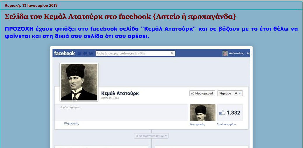 Μια τουλάχιστον περίεργη σελίδα υπάρχει στο facebook,η οποία παρουσίαζεται ως σελίδα του Κεμάλ Ατατούρκ. Υπάρχει και σχετική φωτογραφία του.
