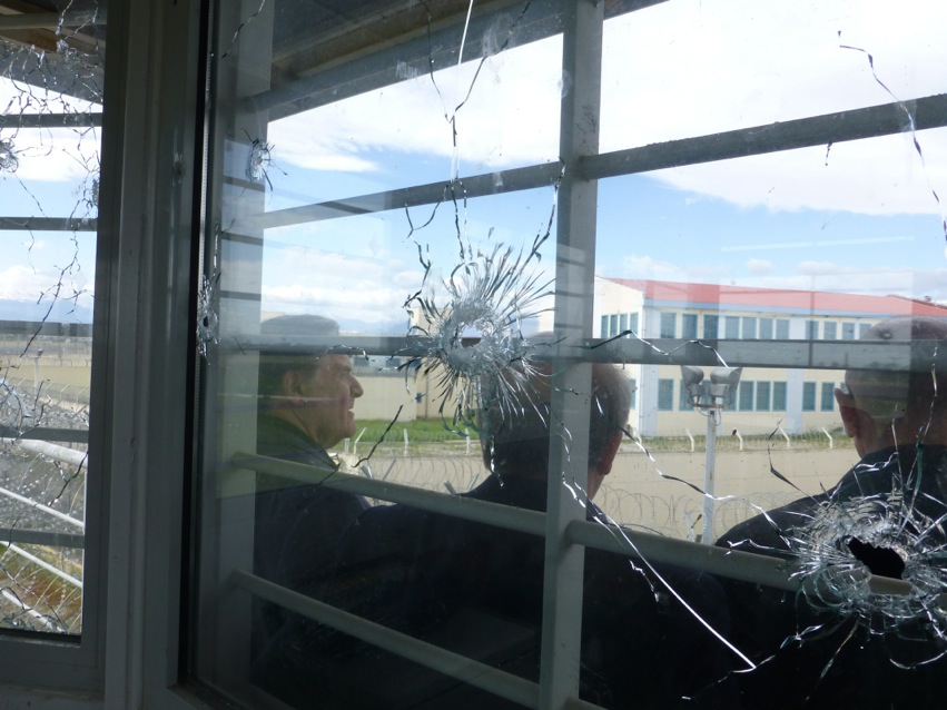 Φωτογραφίες μέσα από τις φυλακές Τρικάλων όπου έγινε η μάχη με τα Καλάσνικοφ. Στις φωτογραφίες οι οποίες είναι από την επίσκεψη αντιπροσωπείας του ΣΥΡΙΖΑ ,φαίνονται τα σημεία στα οποία οι σφαίρες των καλάσνικοφ διαπέρασαν τα φυλάκια των φρουρών.