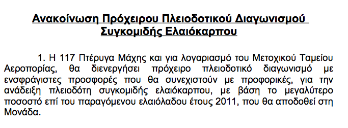 Η 117 Πτέρυγα Μάχης και για λογαριασμό του Μετοχικού Ταμείου Αεροπορίας, θα διενεργήσει πρόχειρο πλειοδοτικό διαγωνισμό με ενσφράγιστες προσφορές που θα συνεχιστούν με προφορικές, για την ανάδειξη πλειοδότη συγκομιδής ελαιόκαρπου, με βάση το μεγαλύτερο ποσοστό επί του παραγόμενου ελαιόλαδου έτους 2011, που θα αποδοθεί στη Μονάδα. Ο διαγωνισμός θα διεξαχθεί στις 20 Δεκεμβρίου ημέρα Τρίτη ώρα 12:00 ενώπιον τριμελούς επιτροπής, στο γραφείο του Επόπτη Οικονομικού (ΕΟΥ) της 117 Π.Μ και η επιλογή του ελαιοτριβείου θα γίνει με μέριμνα Μονάδας.
