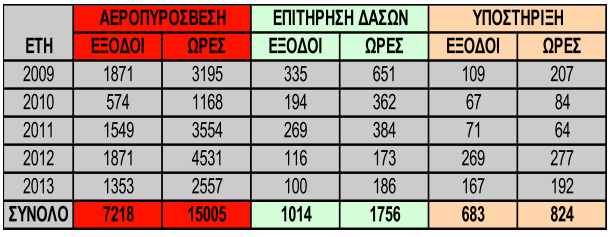 Ο διοικητής της ΔΑΥ υποπτέραρχος Β. Βρεττός διαβεβαίωσε για τη συνέχιση των προσπαθειών για περαιτέρω βελτίωση των μεγεθών αποτελεσματικότητας διαθεσιμότητας κ.λπ. Φέτος τα ιπτάμενα μέσα της Πολεμικής Αεροπορίας πραγματοποίησαν 1.620 εξόδους συμπληρώνοντας 2.935 ώρες πτήσης είτε πάνω από τα πύρινα μέτωπα είτε επιτηρώντας δάση ή υποστηρίζοντας το έργο των συναρμοδίων φορέων.