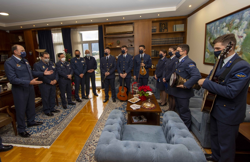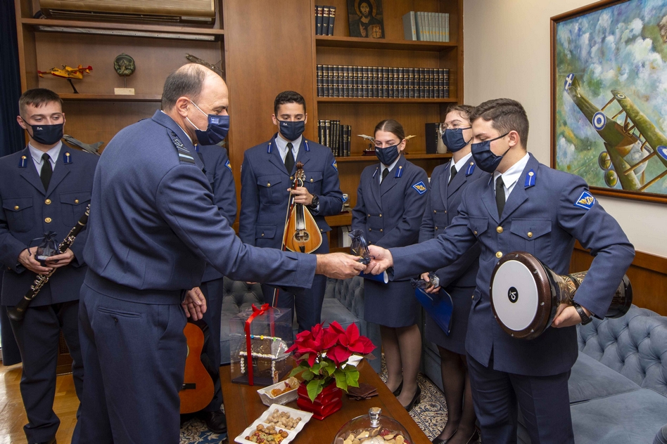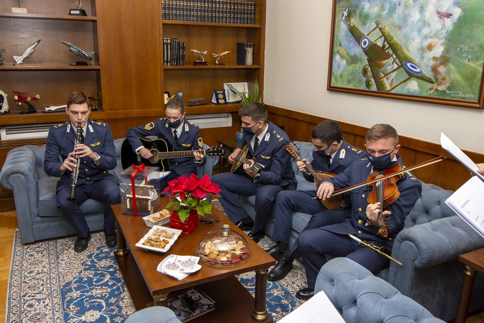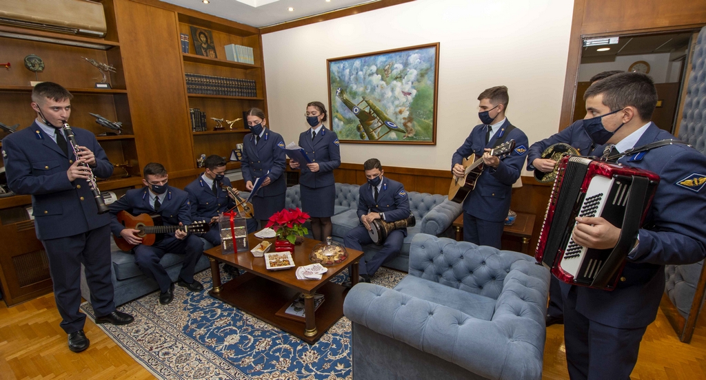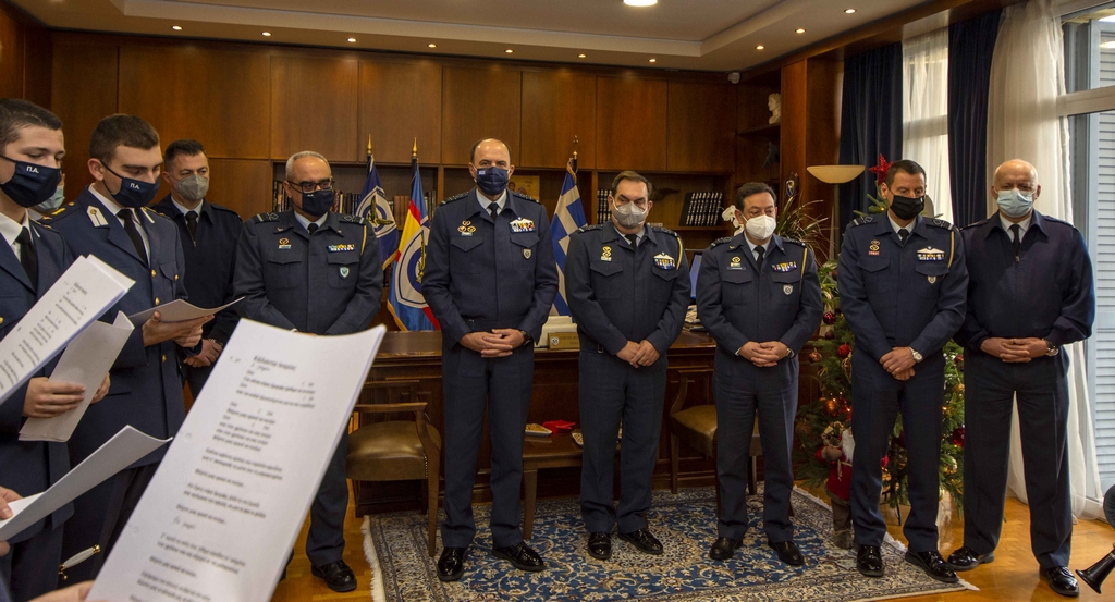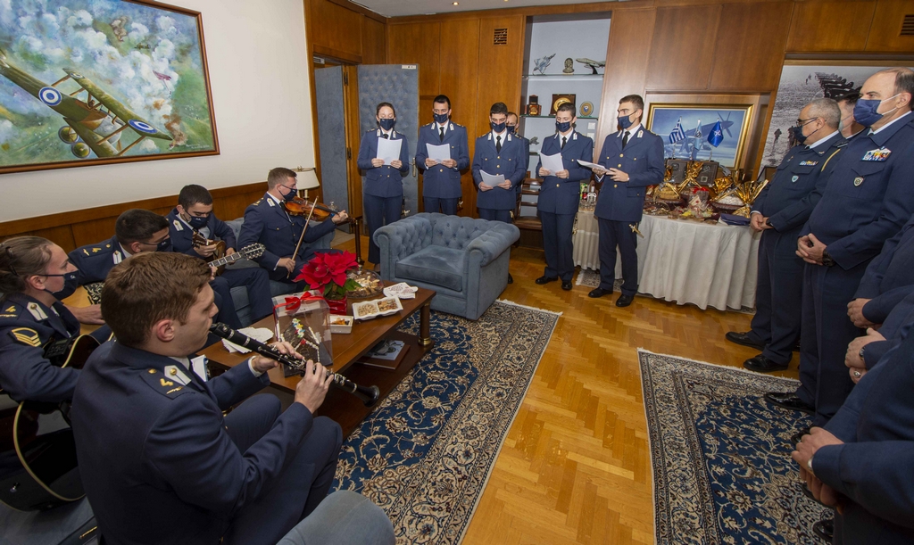 Την ίδια ώρα χθες οι χορωδίες της Σχολής Ικάρων (ΣΙ) και της Σχολής Μονίμων Υπαξιωματικών Αεροπορίας (ΣΜΥΑ) έψαλαν παραδοσιακά κάλαντα και χριστουγεννιάτικες μελωδίες, στον αρχηγό του Γενικού Επιτελείου Αεροπορίας (ΓΕΑ) αντιπτέραρχο Γεώργιο Μπλιούμη και στην ηγεσία του Επιτελείου.