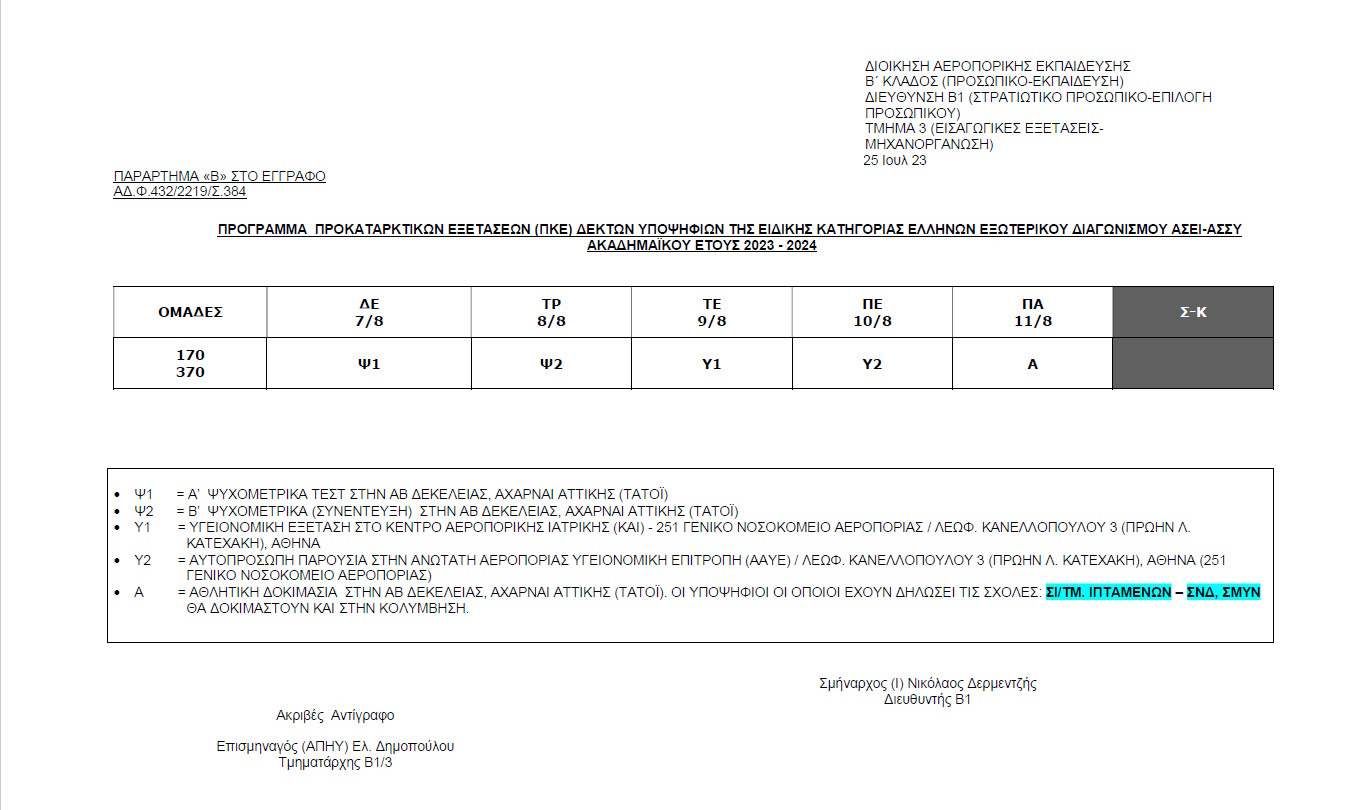 Στην ιστοσελίδα της Πολεμικής Αεροπορίας (www.haf.gr) αναρτήθηκαν οι πίνακες δεκτών υποψηφίων της ειδικής ειδικής κατηγορίας «Έλληνες εξωτερικού» του διαγωνισμού επιλογής στα ΑΣΕΙ-ΑΣΣΥ ακαδημαϊκού έτους 2023-2024, για τις περαιτέρω διαδικασίες επιλογής, καθώς και το αναλυτικό ημερολογιακό πρόγραμμα των Προκαταρκτικών Εξετάσεων (ΠΚΕ).