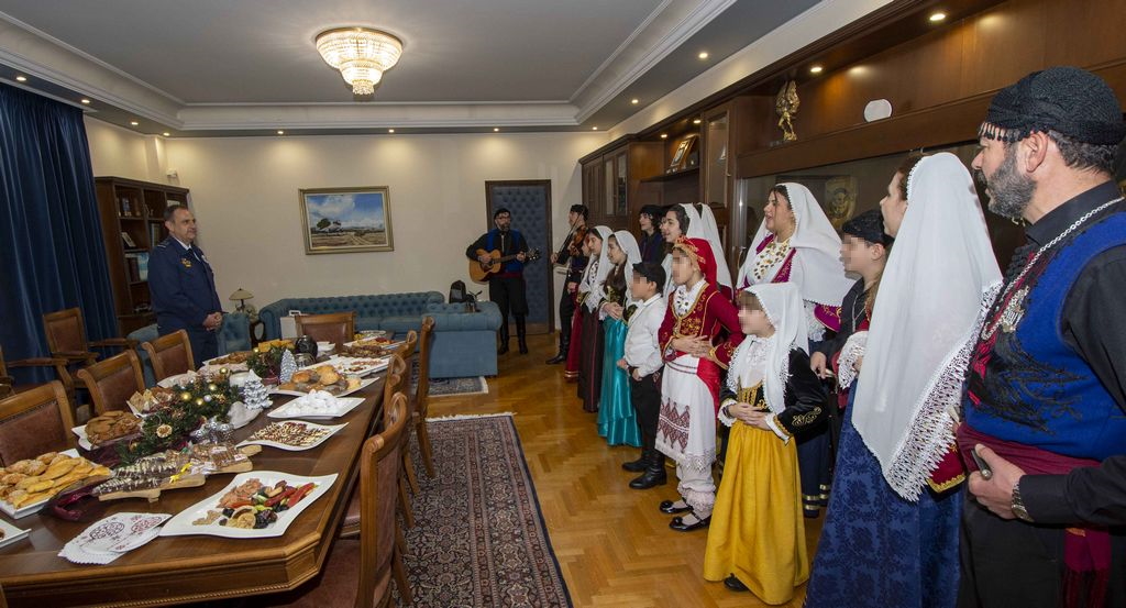 – Πρωτοχρονιάτικα κάλαντα και μελωδίες έψαλαν στον αρχηγό ΓΕΑ, αντιπτέραρχο Θεμιστοκλή Μπουρολιά, και στην ηγεσία του Επιτελείου, η μπάντα της Πολεμικής Αεροπορίας, η μικτή χορωδία Ενόπλων Δυνάμεων και ο κρητικός χορευτικός λαογραφικός Σύλλογος «Απτεραίοι».