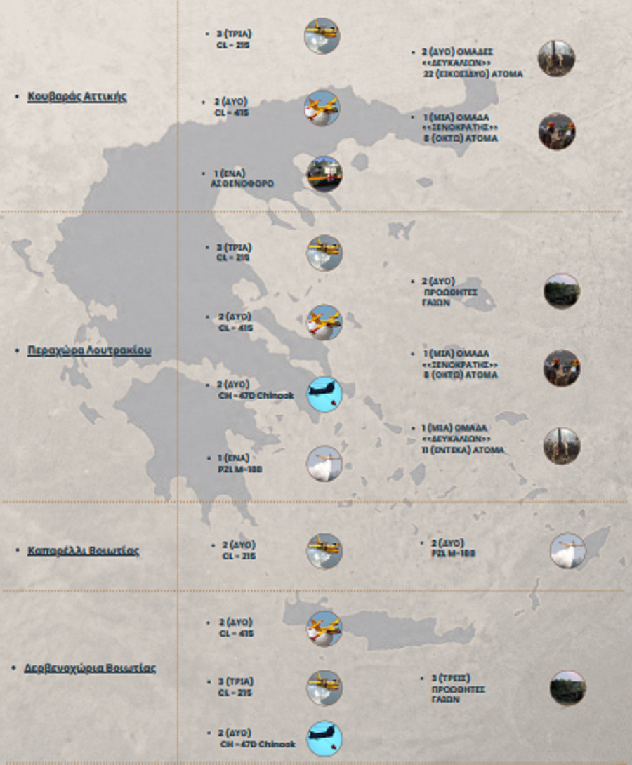 Ειδικότερα στον Κουβαρά Αττικής επιχειρούν 2 Ομάδες «ΔΕΥΚΑΛΙΩΝ» με συνολικά 22 άτομα και ένα ασθενοφόρο. Στην Περαχώρα Λουτρακίου επιχειρούν: