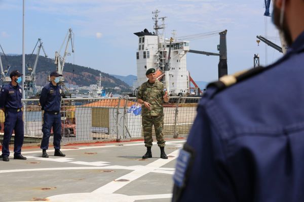 Στη συνέχεια ο Αρχηγός ΓΕΕΘΑ επισκέφθηκε το Αρματαγωγό (Α/Γ) ΡΟΔΟΣ το οποίο ελλιμενίζεται στο Λιμένα του Βόλου και τα τμήματα ετοιμότητας της 32 ΤΑΞ ΠΖΝ, όπου σε σύντομη ομιλία του επεσήμανε τον σημαντικό ρόλο που διαδραματίζει η παρουσία του πλοίου στην περιοχή ως προς την άμεση δυνατότητα ανάληψης αποστολής από τμήματα του Σχηματισμού.