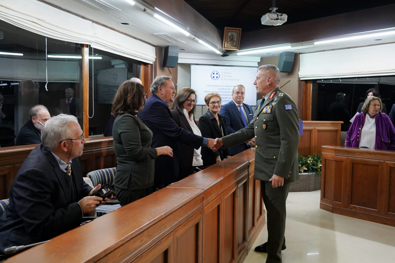Ευχαρίστησε επίσης τον Δήμαρχο κ. Γρηγόρη Κωνσταντέλλο για την διοργάνωση της τιμητικής εκδήλωσης, εξαίροντας τόσο την πολυετή προσφορά του στην τοπική Αυτοδιοίκηση, όσο και την συνδρομή του στην βελτίωση των συνθηκών διαβίωσης των σπουδαστών της Στρατιωτικής Σχολής Ευελπίδων με τα έργα ανακαίνισης και ανακατασκευής των υποδομών της καθώς και της ανάπλασης των εξωτερικών της χώρων.
