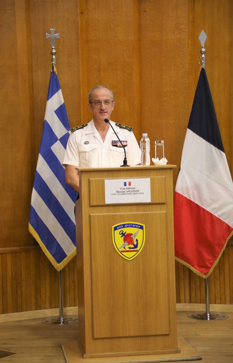 Κατά την παραμονή του στο ΓΕΕΘΑ ο Vice Admiral Nicolas Vaujour πραγματοποίησε ομιλία με θέμα «The Current French Operations», σε προσωπικό των Κλάδων Επιχειρήσεων του ΓΕΕΘΑ, των Γενικών Επιτελείων και της Διοίκησης Ειδικού Πολέμου, στο αμφιθέατρο «ΕΠΙΣΜΗΝΑΓΟΣ (Ι) ΔΗΜΗΤΡΙΟΣ ΚΑΜΠΕΡΟΣ».