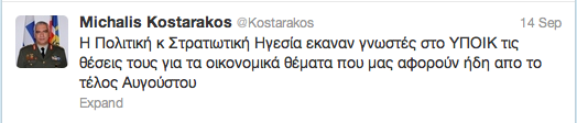 @ Kostarakos, Η Πολιτική κ Στρατιωτική Ηγεσία εκαναν γνωστές στο ΥΠΟΙΚ τις θέσεις τους για τα οικονομικά θέματα που μας αφορούν ήδη απο το τέλος Αυγούστου