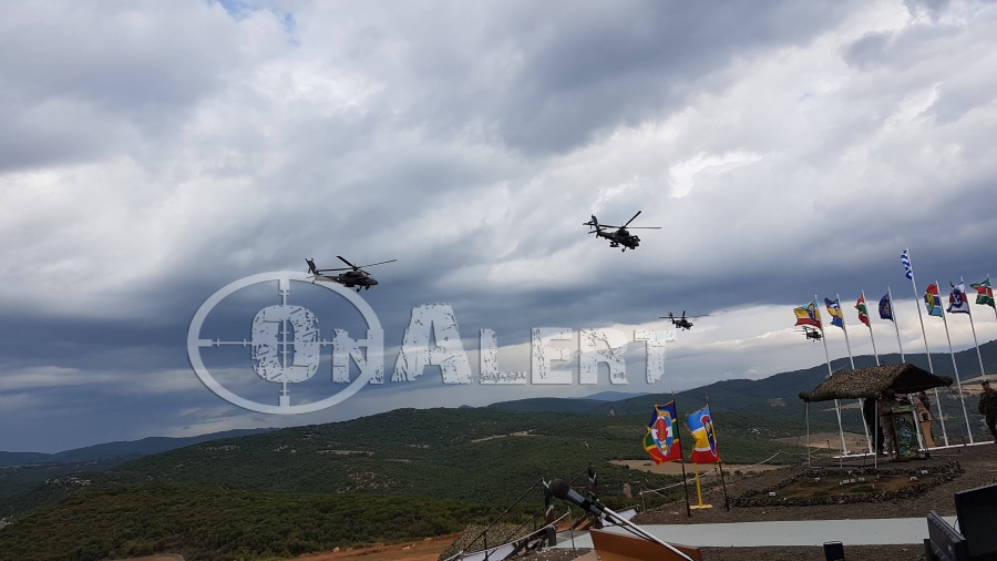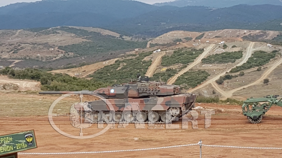 Άρματα μάχης, δυνάμεις του πυροβολικού, ελικόπτερα και μαχητικά αεροσκάφη πραγματοποιούν επίδειξη ισχύος στο Ύψωμα «Αετού» στον Έβρο, παρουδία του ΑΝΥΕΘΑ, Πάνου Ρήγα, της ΥΦΕΘΑ, κα Κόλλιας-Τσαρουχά, αλλά και του Αρχηγού του Γενικού Επιτελείου Εθνικής Άμυνας, Ναυάρχου Ευάγγελου Αποστολάκη.