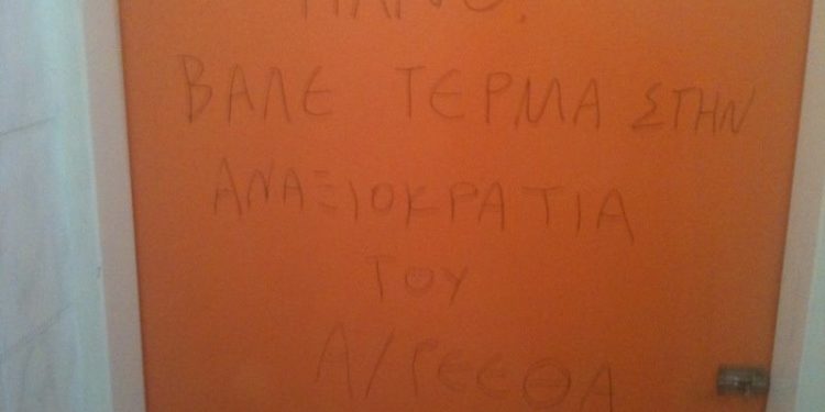 Συναγερμός στο ΓΕΕΘΑ από ένα σύνθημα που εντοπίστηκε να είναι γραμμένο σε πόρτα τουαλέτας. Ειναι αυτό που βλέπετε στην φωτογραφία, το οποίο κάποιοι πρόλαβαν να το τραβήξουν φωτογραφία.