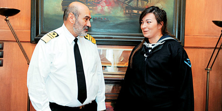 Ο νέος Α/ΓΕΝ Κοσμάς Χρηστίδης κοιτάζει …με νόημα την ΕΠΟΠ του. Το …νόημα έχει να κάνει με το γεγονός ότι η χαμογελαστή ΕΠΟΠ τη φωτογραφίας είναι η κόρη του Α/ΓΕΝ Κλειώ,που κοιτάζει προφανώς με καμάρι τον Αρχηγό και πατέρα της. Για την ιστορία η κόρη του Αρχηγού είναι “μάχιμη” και υπηρετεί στη φρεγάτα Σαλαμίς.