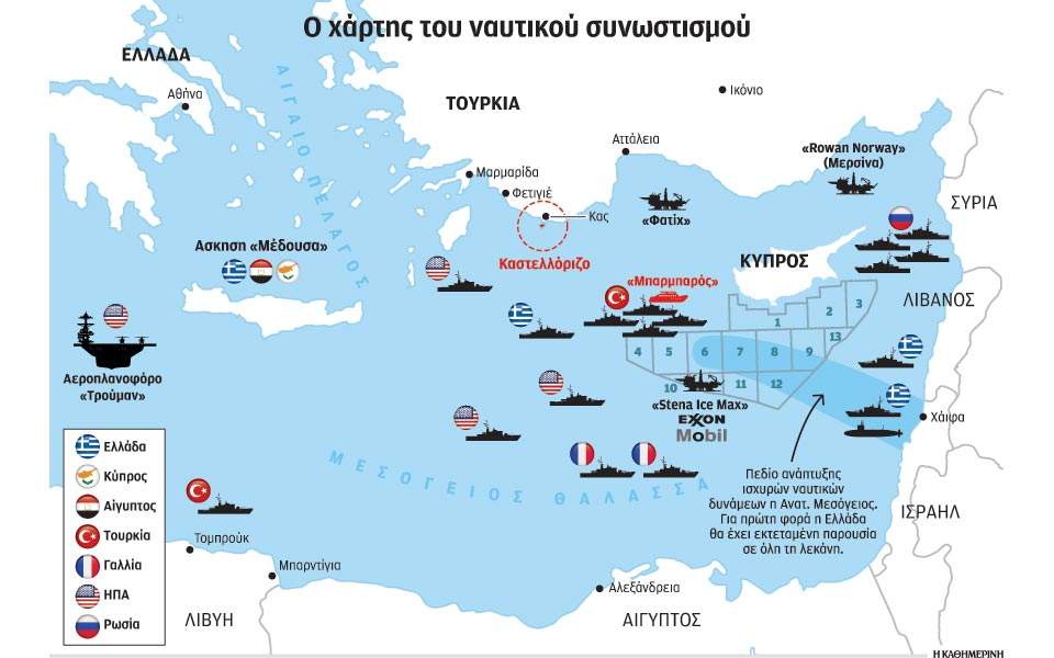 Παράλληλα με αυτή την έντονη ναυτική κινητικότητα, η οποία θα είναι ενταγμένη σε συμμαχικό πλαίσιο, θα προχωρήσει η δημιουργία μιας νέας δομής ασφαλείας στην Ανατολική Μεσόγειο με τη συμμετοχή και των ΗΠΑ, τη στιγμή που και οι Γάλλοι επιθυμούν να αυξήσουν το αποτύπωμά τους στην περιοχή. Παρά την ένταση στην κυπριακή ΑΟΖ, το κονσόρτσιουμ ExxonMobil-Qatar Petroleum αναμένεται να συνεχίσει απρόσκοπτα τις γεωτρήσεις που διεξάγονται ήδη στο οικόπεδο 10, ενώ τη δική της πολιτική υδρογονανθράκων συνεχίζει και η Αγκυρα, παρά την οικονομική κρίση στην οποία έχει εισέλθει η Τουρκία. Σε όλο αυτό το ρευστό περιβάλλον, η διπλωματική προσπάθεια οριοθέτησης θαλασσίων ζωνών παραμένει εκκρεμής, ενώ φαίνεται ότι στο μέτωπο των επαφών με την Τουρκία γίνονται ορισμένα βήματα, πολλά εκ των οποίων παραπέμπουν σε παλαιότερες συνταγές.