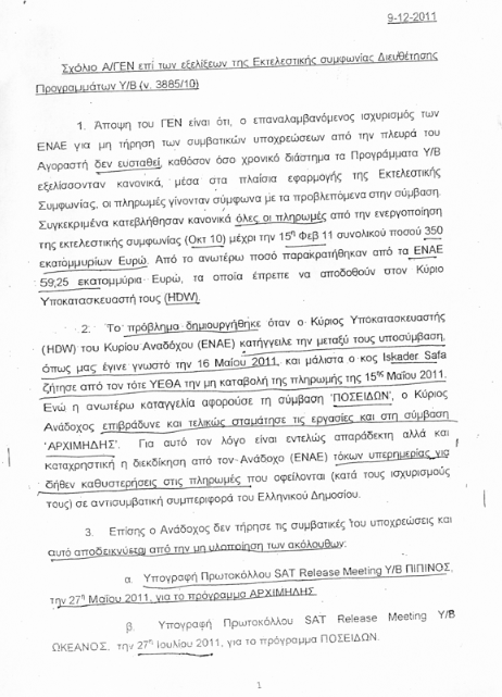 Το έγγραφο είναι σχόλιο του τότε Α/ΓΕΝ “επί των εξελίξεων της εκτελεστικής συμφωνίας διευθέτησης προγραμμάτων υποβρυχίων (νόμος 3885/10)”. Δηλαδή ο νόμος Βενιζέλου.