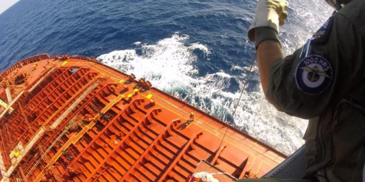 Ο ασθενής μεταφέρθηκε στην 112 Πτέρυγα Μάχης, στην αεροπορική βάση Ελευσίνας, όπου και παρελήφθη από το ΕΚΑΒ. Στιγμιότυπα από την επιχείριση παραλαβής του ασθενούς από το τάνκερ για την αεροδιακομιδή του, στις φωτογραφίες που έδωσε στην δημοσιότητα το ΠΝ.