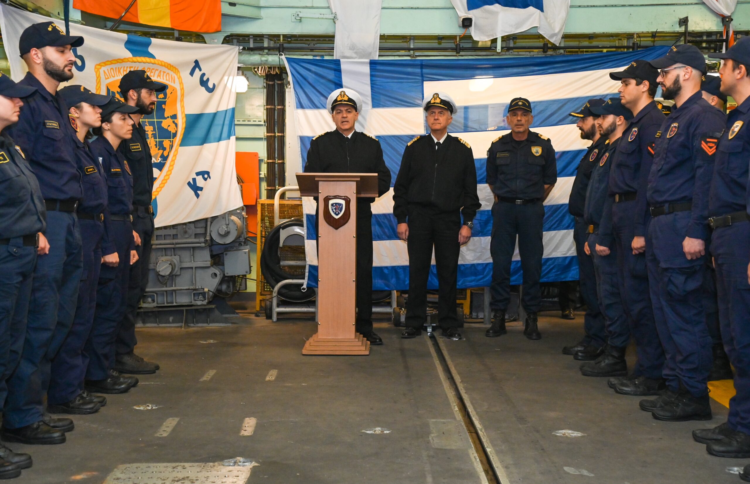 Μετά τον κατάπλου της Φ/Γ «ΣΠΕΤΣΑΙ» στο ΝΣ, ο Αρχηγός ΓΕΝ Αντιναύαρχος Δημήτριος – Ελευθέριος Κατάρας ΠΝ, επέβη στο πλοίο συνοδευόμενος από τον Αρχηγό Στόλου Αντιναύαρχο Πολυχρόνη Κουλούρη ΠΝ και καλωσόρισαν τον Κυβερνήτη καθώς και το πλήρωμα της Φ/Γ, συγχαίροντας τους για την επιτυχή ολοκλήρωση της αποστολής.