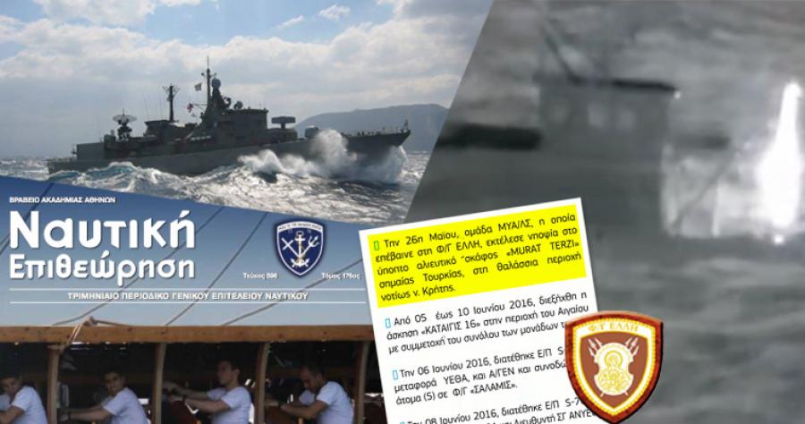 Ωστόσο όπως φαίνεται και στο απόσπασμα από την Ναυτική Επιθεώρηση, που αναδημοσιεύει το OnAlert η συγκεκριμένη “αποστολή” του πολεμικού πλοίου, είναι καταγεγραμμένη στις δραστηριότητες που πάγια περιλαμβάνονται στο επίσημο περιοδικό του ΓΕΝ. Συγκεκριμένα στον τόμο 176 του τεύχους 596, αναφέρεται ότι: “ Την 26η Μαΐου ομάδα “ΜΥΑ/ΛΣ η οποία επέβαινε στη Φ/Γ ΕΛΛΗ, εκτέλεσε νηοψία στο ύποπτο αλιευτικό σκάφος “MURAT TERZI” σημαίας Τουρκίας, στη θαλάσσια περιοχή νοτίως της ν.Κρήτης”.