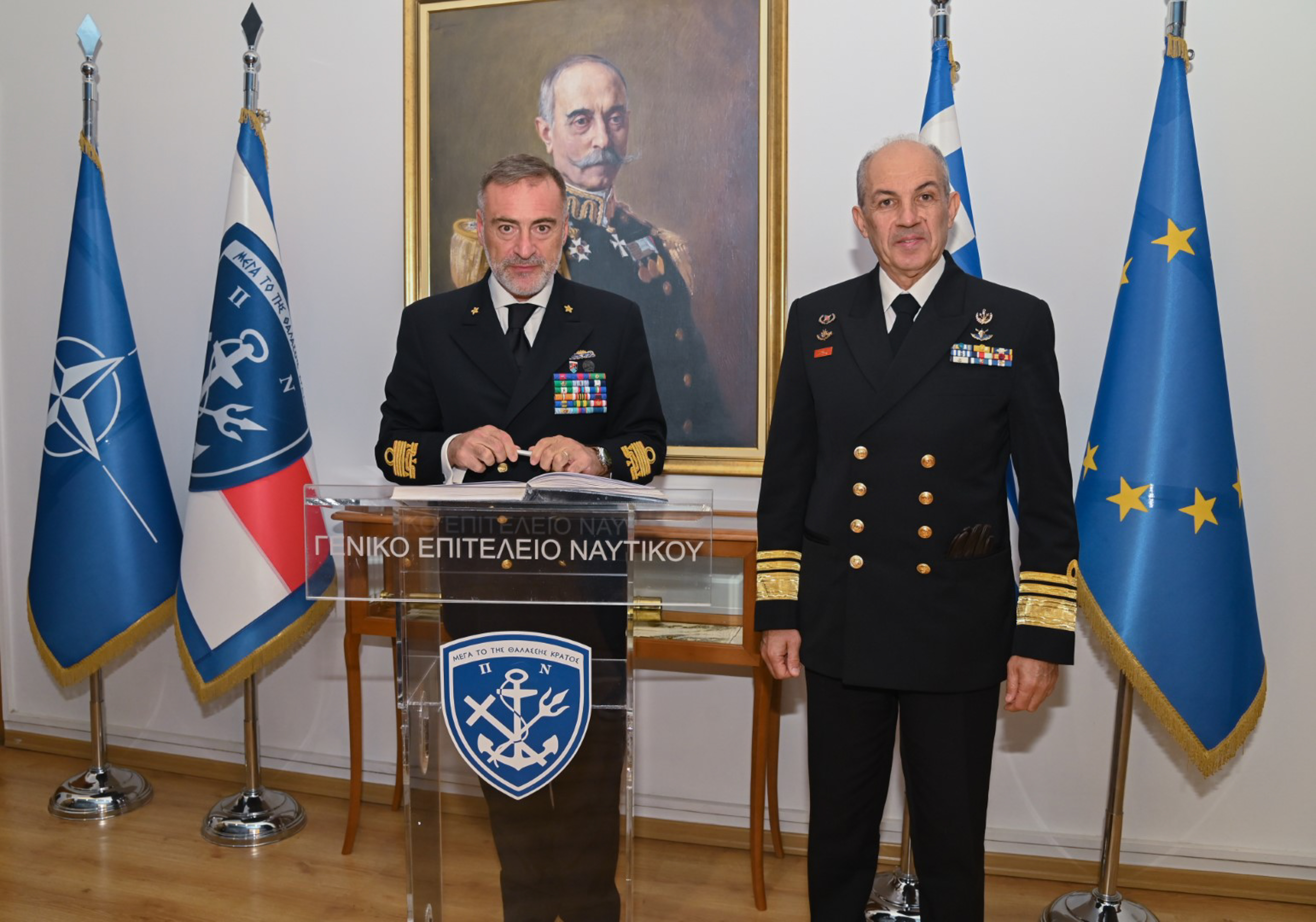 ‘Οπως ανακοινώθηκε από το ΓΕΝ, ο αρχηγός Ναυτικού της Ιταλίας επισκέφθηκε το Γενικό Επιτελείο Ναυτικού και συναντήθηκε με τον αρχηγό ΓΕΝ. Στις κατ’ ιδίαν συνομιλίες συζητήθηκαν θέματα αμοιβαίου ενδιαφέροντος με έμφαση στη διαμορφούμενη κατάσταση στην ανατολική Μεσόγειο, την περαιτέρω ενίσχυση και διεύρυνση της διμερούς συνεργασίας των Ναυτικών Ελλάδας και Ιταλίας, καθώς επίσης ενημερώθηκε επί των δραστηριοτήτων του Πολεμικού Ναυτικού.