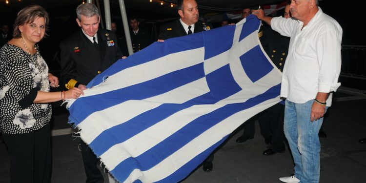 Η σημαία που από το 1982 κυμάτιζε στην ακρόπολη του Νιόκαστρου Ναβαρίνου παραδίδεται στον κυβερνήτη της φρεγάτας που φέρει το όνομα της ιστορικής ναυμαχίας,από τον Δημήτρη Πανοσκάλτση, . Η σημαία παραδόθηκε και πλέον με εντολή του Αρχηγού Στόλου ,κάθε πολεμικό πλοίο που θα καταπλέει στο Ναβαρίνο θα έχει υψωμένη αυτή τη σημαία. Η φωτογραφία είναι του Δημήτρη Παναγιωτόπουλου.