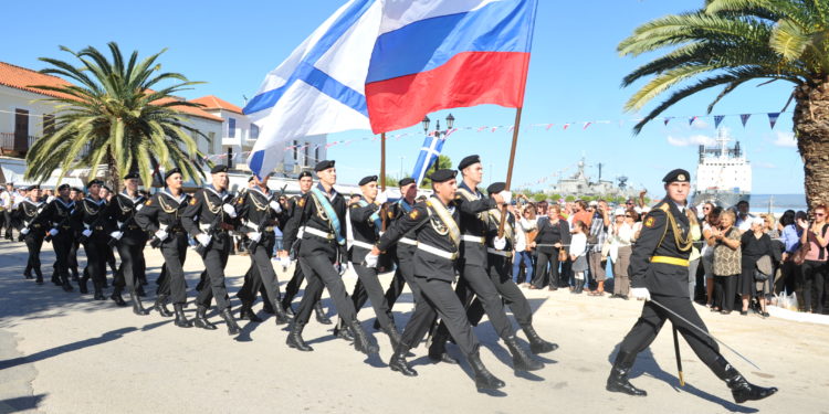 Ήρθαν οι Ρώσοι ,αλλά όχι για να μας σώσουν όπως γράφουν συχνά πυκνά οι λάτρεις της θεωρίας του “ξανθού γένους”. Παρέλαση του πληρώματος του βοηθητικού σκάφους του Στόλου της Μαύρης θάλασσας ΚΙΛ-158 βλέπετε στη φωτογραφία από τη Πύλο όπου “έδεσε” το ρωσικό πλοίο.