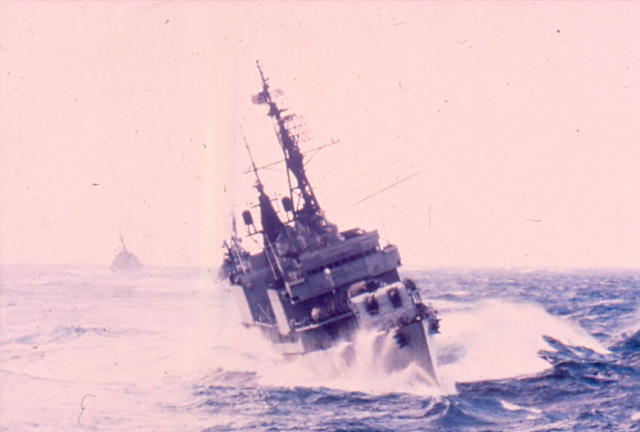 Την πρώτη μέρα όλα καλά. Και ο καιρός επίσης με εξαίρεση κάτι χαμηλές ομίχλες. Δεν θυμάμαι αν σ’ αυτή την άσκηση είδα και την πρώτη φάλαινα στο Αιγαίο, πάνω απ’ τον Καβο Ντόρο, με ένα φαλαινάκι σαν τορπίλη να στρυφογυρίζει δίπλα της. (όταν ανέφερα την παρουσία της, οι από τα πλοία με “ψιλοχλεύαζαν” ότι τάχα είδα ένα πυργίσκο Υποβρυχίου και το πέρασα για φάλαινα. Έλα μου όμως που είχα την OLYMPUS μαζί μου… Και μετά την άσκηση …κατάπιαν τα σχόλια)