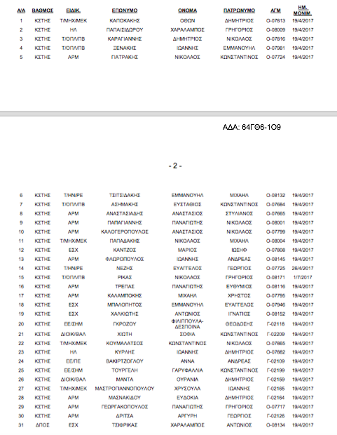 Μονιμοποιούνται σύμφωνα με τις συνδυασμένες διατάξεις της παραγράφου 1 του άρθρου 5 του ν. 2936/01 (ΦΕΚ 166/25-07-2001, τ.Α΄) όπως τροποποιήθηκε και ισχύει με το ν. 3036/2002 (ΦΕΚ 171/23-7-2002, τ.Α΄) και της παραγράφου 8 του άρθρου 7 της υπ’ αριθ. πρωτ. Φ.416/205235/12-11-2001 (ΦΕΚ 1610/05-12-2001, τ.Β΄) αποφάσεως Υπουργού Εθνικής Άμυνας, όπως τροποποιήθηκε και ισχύει με την υπ’ αριθ. πρωτ. Φ.424/35/160822/Σ.2037/19-12-2007 (ΦΕΚ 2507/31-12-2007 τ.Β΄) αποφάσεως Υπουργού Εθνικής Άμυνας και λαμβάνοντας υπόψη το υπ’ αριθ. 4 από 25 Οκτωβρίου 2017, πρακτικό συνεδριάσεων του Συμβουλίου Εκτάκτων Κρίσεων Ανθυπασπιστών–Υπαξιωματικών και ΕΠ.ΟΠ., οι κατωτέρω Επαγγελματίες Οπλίτες (ΕΠ.ΟΠ.), με ημερομηνία μονιμοποιήσεως την έναντι εκάστου αναφερομένη: