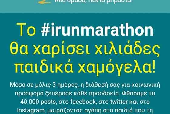 Η Εθνική Τράπεζα είχε δεσμευτεί να δώσει 5000 ευρώ στο Κέντρο αρκεί να γίνονταν αναρτήσεις σε Facebook, Instagram και Twitter που θα συνοδεύονται από το #irunmarathon. Για κάθε ανάρτηση #irunmarathon, και μέχρι τη συγκέντρωση έως και 10,000 αναρτήσεων, η Εθνική Τράπεζα θα προσέφερε 0,50€ στο “Κέντρο Ειδικής Φροντίδας Παιδιών” (ΚΕΦΠ), του Ναυτικού Νοσοκομείου Πειραιώς.