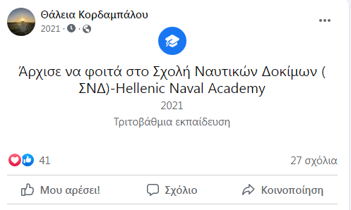 Η 19χρονη είχε μάλιστα δημοσιεύσει την είσοδο της στην Σχολή στο Facebook, εκφράζοντας έτσι την χαρά της, ενώ συγγενείς και φίλοι της εύχονταν συγχαρητήρια για το κατόρθωμά της.