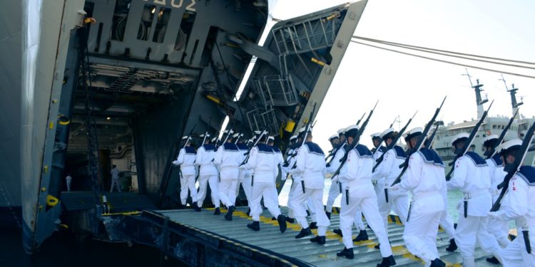 Προ απόπλου, ο Αρχηγός Στόλου Αντιναύαρχος Ιωάννης Παυλόπουλος ΠΝ, συνοδευόμενος από τον Υπαρχηγό Στόλου Υποναύαρχο Ευθύμιο Μικρό ΠΝ, επισκέφθηκε το αρματαγωγό ΡΟΔΟΣ, με το οποίο θα διεξαχθεί ο εκπαιδευτικός πλους και απεύθυνε χαιρετισμό στους Δόκιμους Υπαξιωματικούς.