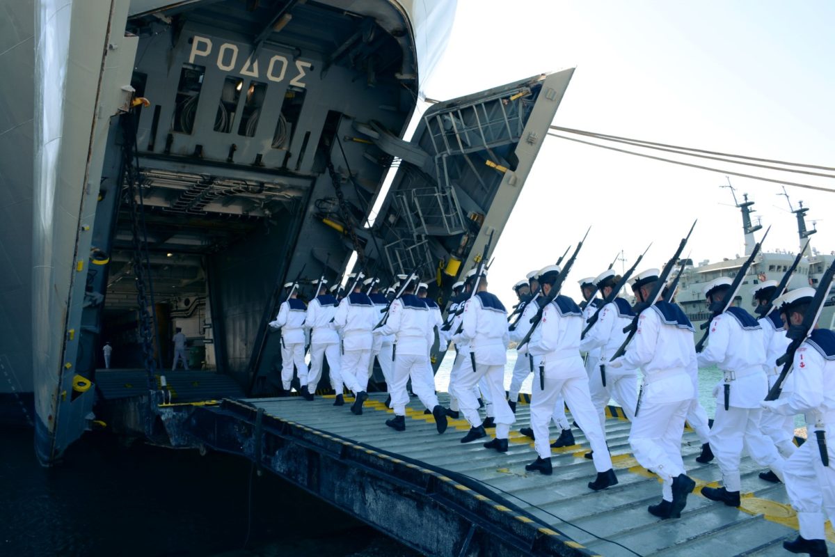 Προ απόπλου, ο Αρχηγός Στόλου Αντιναύαρχος Ιωάννης Παυλόπουλος ΠΝ, συνοδευόμενος από τον Υπαρχηγό Στόλου Υποναύαρχο Ευθύμιο Μικρό ΠΝ, επισκέφθηκε το αρματαγωγό ΡΟΔΟΣ, με το οποίο θα διεξαχθεί ο εκπαιδευτικός πλους και απεύθυνε χαιρετισμό στους Δόκιμους Υπαξιωματικούς.