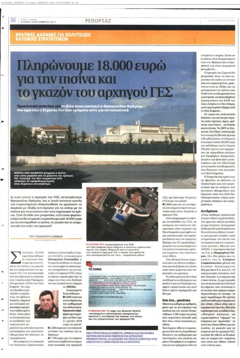 Το Πρώτο Θέμα δημοσιεύει ρεπορτάζ για το σπίτι το οποίο έχει παραχωρηθεί και στον σημερινό Α/ΓΕΣ Φ.Φράγκο,το οποίο βρίσκεται σε συγκρότημα έξι κατοικιών τις οποίες χρησιμοποιούν οι εκάστοτε Α/ΓΕΣ και οι αντιστράτηγοι.