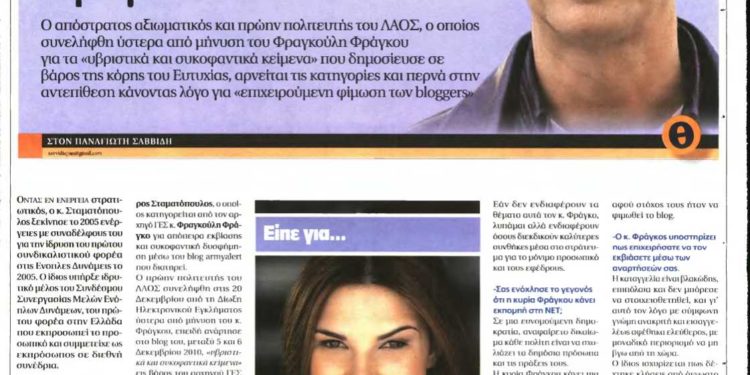 Αφού όμως ο συνταγματάρχης,δηλώνει δημοσίως ότι διαχειρίζεται το επίμαχο blog, λύνει και τα δικά μας χέρια. Όχι ότι δεν ήταν γνωστός εδώ και πάρα πολύ καιρό. Πολύ πριν από τη σύλληψή του,οι πάντες στο υπουργείο Άμυνας γνώριζαν τη ταυτότητα του διαχειριστή.Ο ίδιος υποστηρίζει ότι αφού πληρώνει για την ΕΡΤ,έχει το δικαίωμα να κάνει κριτική στην τηλεοπτική εκπομπή της κόρης του Α/ΓΕΣ. Κατά τ΄ άλλα ο συνταγματάρχης είναι αρκετά προσεκτικός στα όσα λέει στη συνέντευξή του.