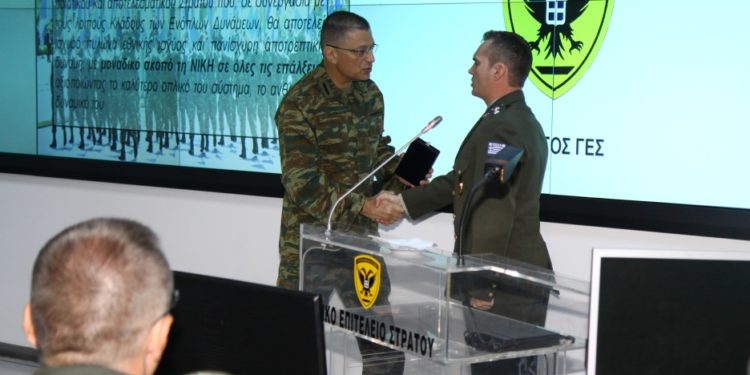 Ο Υπολοχαγός, παρουσίασε συνοπτικά στην Ιεραρχία και στο Επιτελείο του ΓΕΣ, την εργασία του «Λαβή Αντικυρτού Ολυμπιακού Τόξου Άτλας».