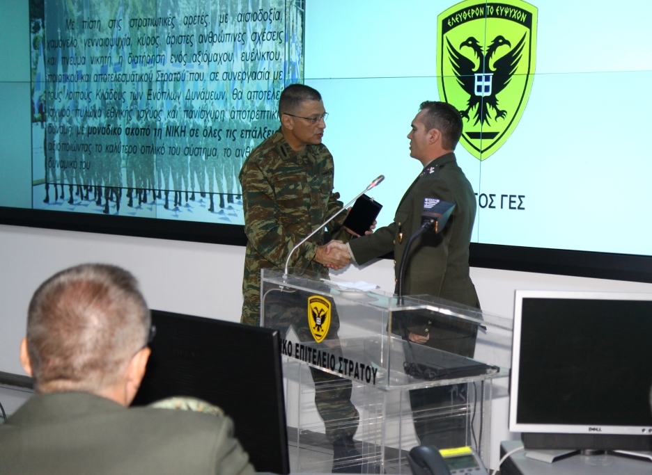 Ο Υπολοχαγός, παρουσίασε συνοπτικά στην Ιεραρχία και στο Επιτελείο του ΓΕΣ, την εργασία του «Λαβή Αντικυρτού Ολυμπιακού Τόξου Άτλας».