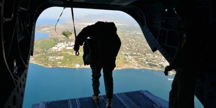 Τα στελέχη επιχειρούν εκπαίδευση επί του εδάφους πριν το άλμα από ψηλά.