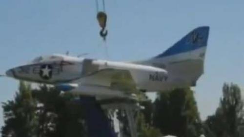 Μετά το ατύχημα του γερανού το Α-4 Skyhawk πήγε πίσω για επιδιόρθωση και τώρα είναι στη θέση του στο Alameda Point στην παραλιακή πόλη Αλαμήντα.