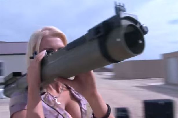 Το βίντεο δειχνει τα μοντέλα να ποζάρουν – με τα μικροσκοπικά τους μπικίνι – με αυτοματα και μπαζούκας, και να βρίσκονται σε τάνκς.