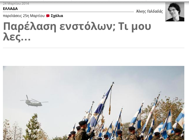 Παραμονή της παρέλασης στην Αθήνα στο protagon.gr του Σταύρου Θεοδωράκη δημοσιεύθηκε ένα κείμενο του Άλκη Γαλδαδά (το βιογραφικό του στο τέλος του κειμένου αρκετά ενδιαφέρον με μεγάλη δόση ειλικρίνειας και αυτοσαρκασμού) ,το οποίο νομίζουμε είναι μνημείο αδικίας για τις ΕΔ. Δεν θα υποστηρίξουμε ότι σε κάποια σημεία του μπορεί να λέει αλήθειες, αλλά τις λέει μισές και το χειρότερο βάζει στο ίδιο τσουβάλι άπαντες!